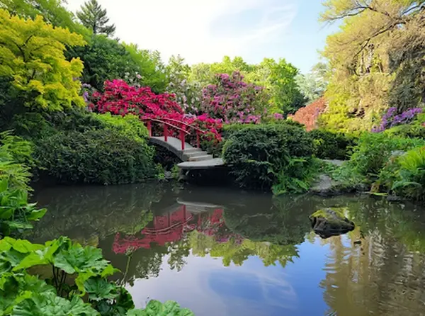 Zajímavosti: The garden's signature stone bridge, assembled by Japanese craftsmen, showcases a unique joinery technique without nails or glue. Visitors might catch the quiet koi fish moving beneath clear water in peaceful lily ponds.