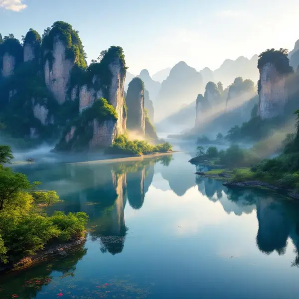 Rýchle fakty: El lago tiene aguas cristalinas que reflejan los picos karsticos de la zona, ofreciendo un paisaje que parece sacado de un cuento. En sus alrededores, se encuentran antiguos senderos que los locales usaban para transportar té y especias.